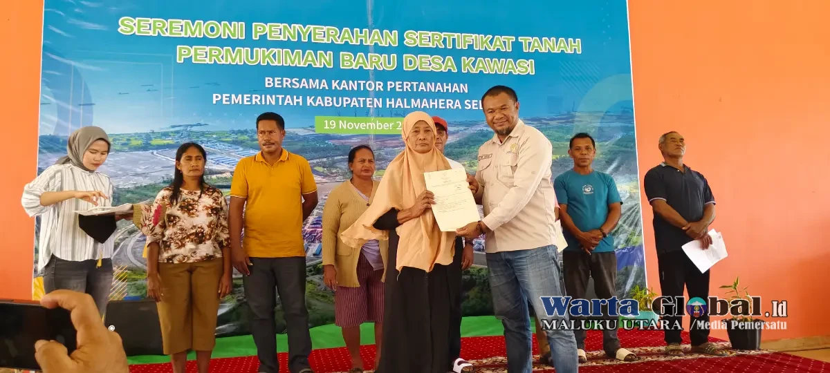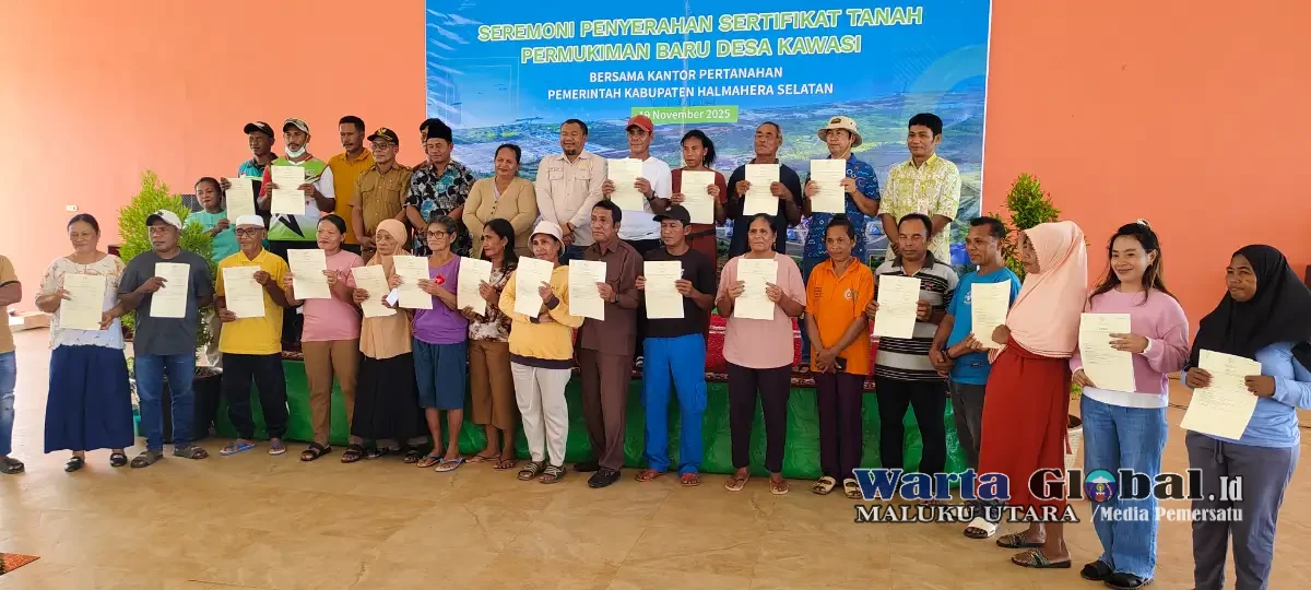 Hal-Sel, WARTAGLOBAL.id - Desa Kawasi, Kecamatan Obi, Kabupaten Halmahera Selatan (Hal-Sel) menjadi pusat perhatian pada Rabu siang ketika seremoni penyerahan sertifikat tanah untuk permukiman baru resmi digelar di Gedung Serba Guna desa setempat. Acara ini merupakan bagian dari komitmen pemeritah daerah dalam mendukung legalitas dan kepastian pengelolaan lahan bagi masyarakat Kawasi, khususnya mereka yang menempati permukiman baru bagi warga setempat. Rabu, 19/11/2025.
